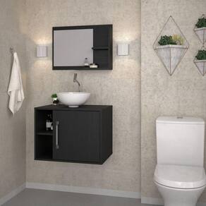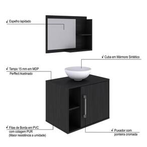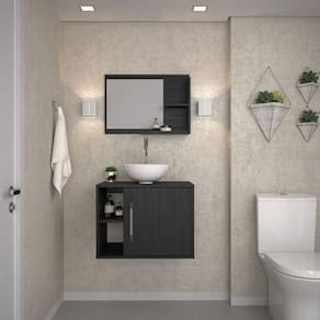 O Conjunto Balcão com Cuba e Espelheira Laura 600 KTLR600 tem design compacto, perfeito para pequenos espaços, conta com uma prateleira lateral e uma cuba de apoio, além da espelheira. Possui fitas de borda em PVC com colagem PUR, garantindo maior durabilidade ao seu móvel. Acabamento da Cuba: Gel Acabamento da Porta: BP Acetinado Acabamento da Prateleira: BP Acetinado Acompanha Cuba: Sim Acompanha Tampo: Sim codigo_ean: 7908439698047 Complexidade da Montagem: Média: pode ser montado por mais de uma pessoa e/ou necessite de maior conhecimento para montagem Cor: Preto Onix Cor da Cuba: Branco Cor do Produto: Preto Ônix Cor Interna: Preto Escala de Brilho: Fosco Escala de Brilho da Porta: Fosco Escala de Brilho da Prateleira: Fosco Espessura do Espelho: 3 mm Formato do Espelho: Retangular Furação para Cuba e Torneira: Não Itens Inclusos: 1 Gabinete com Cuba, 1 Espelheira, kit de ferragens e manual de montagem Linha ou Coleção: Laura 600 Manual de Montagem e Instalação: https://product-hub-prd.madeiramadeira.com.br/672365/documents/a557cf50-3574-4921-8271-4d17d6b981d68113manualgabinetelaura600.pdf Material da Cuba: Mármore Sintético Material da Porta: MDP Material da Prateleira: MDP Material do Puxador da Porta: ABS Material do Tampo: MDP Material Principal: MDP Medida da Cuba (C x L x P): 30,5cm x 30,5cm x 12,5cm Medida da Espelheira (A x L x P): 42cm x 60cm x 11,5cm Medida do Gabinete (A x L x P): 45cm x 60cm x 40cm Necessita Montagem: Sim Origem do Produto: Nacional Peso: 20,37 kg Peso Máximo por Prateleira: 1 kg Possui Espelheira: Sim Possui Gabinete: Sim Possui Gavetas: Não Possui iluminação: Não Possui Pés: Suspenso Possui Portas: Sim Possui Rodízio: Não Produto Montado: Sim Recomendações de Uso, Manutenção e Limpeza: Para a limpeza, utilize flanela seca ou pano macio levemente umedecido em água. Utilize um pano seco em seguida. Evite contato com produtos químicos (solventes, thinner, acetona, etc) e não utilize nenhum tipo de esponja de aço. Sistema de Montagem: Parafusos e buchas Tamanho do Espelho (A x L): 40cm x 35cm Tipo de Dobradiça/Corrediça da Porta: Metálica Tipo de Porta: Bater Tipo de Puxador da Porta: Externo