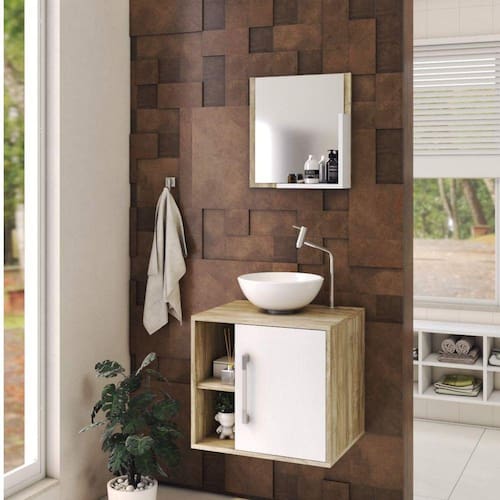 O kit Soft 500 é um produto compacto e econômico, de design simples, projetado para espaços pequenos, perfeito para fazer parte do seu banheiro. Produzido todo em MDP-BP Acetinado 15mm amadeirado, conta com uma cuba de apoio e uma espelheira com prateleira. Acabamento da Cuba: Gel Acabamento da Porta: BP Acetinado Acabamento da Prateleira: BP Acetinado Acompanha Cuba: Sim Acompanha Tampo: Sim codigo_ean: 7893640098604 Complexidade da Montagem: Média: pode ser montado por mais de uma pessoa e/ou necessite de maior conhecimento para montagem Cor: Carvalho/Branco Chess Cor da Cuba: Branco Cor Interna: Branco Escala de Brilho: Fosco Escala de Brilho da Porta: Fosco Escala de Brilho da Prateleira: Fosco Espessura do Espelho: 3 mm Formato do Espelho: Retangular Furação para Cuba e Torneira: Não Itens Inclusos: 1 Gabinete com Cuba, 1 Espelheira e Manual de Montagem. Linha ou Coleção: Soft Manual de Montagem e Instalação: https://product-hub-prd.madeiramadeira.com.br/538759/documents/9942a2e5-8555-4671-ab41-cb4310d8da69nualdemontagemsoft500siena.pdf Material da Cuba: Mármore Sintético Material da Porta: MDP Material da Prateleira: MDP Material do Puxador da Porta: ABS Material do Tampo: MDF/MDP Material Principal: MDP Medida da Cuba (C x L x P): 30,5cm x 30,5cm x 12,5cm Medida da Espelheira (A x L x P): 42cm x 40cm x 10cm Medida do Gabinete (A x L x P): 46cm x 50cm x 40cm Necessita Montagem: Sim Origem do Produto: Nacional Peso: 18 kg Peso Máximo por Prateleira: 1 kg Possui Espelheira: Sim Possui Gabinete: Sim Possui Gavetas: Não Possui iluminação: Não Possui Pés: Suspenso Possui Portas: Sim Possui Rodízio: Não Produto Montado: Sim Recomendações de Uso, Manutenção e Limpeza: Para a limpeza, utilize flanela seca ou pano macio levemente umedecido em água. Utilize um pano seco em seguida. Evite contato com produtos químicos (solventes, thinner, acetona, etc) e não utilize nenhum tipo de esponja de aço. Sistema de Montagem: Parafusos e Buchas. Tamanho do Espelho (A x L): 40cm x 35cm Tipo de Dobradiça/Corrediça da Porta: Metálica Tipo de Porta: Bater Tipo de Puxador da Gaveta: Externo Tipo de Puxador da Porta: Externo