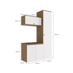 Acabamento: Pintura Brilho / Pintura Touch | Cor: Nogueira/Branco | Dobradiça: Com Amortecimento / Sem Amortecimento | Garantia: 3 meses para defeito de fabricação | Matéria-prima: MDF | Peso suportado por cada prateleira: 7 kg | Puxadores: Alumínio / Metálicos | Quantidade de portas: 1 / 2 | Quantidade de prateleiras: 1 / 5 | Sistema de montagem: Parafuso Philips | Tipo de porta: Bater