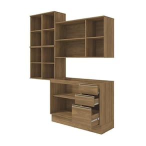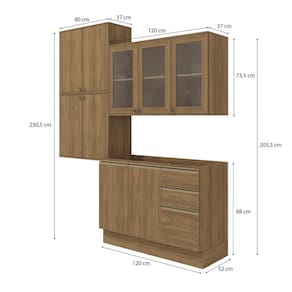 Acabamento: Pintura Touch | Cor: Nogueira | Corrediças: Telescópicas | Dobradiça: Com Amortecimento | Garantia: 3 meses para defeito de fabricação | Matéria-prima: MDF / MDF/ Vidro | Peso suportado por cada gaveta: 6 Kg | Peso suportado por cada prateleira: 7 kg | Puxadores: Metálicos / Puxadores de Metal e de Alumínio | Quantidade de gavetas: 3 | Quantidade de portas: 2 / 3 | Quantidade de prateleiras: 1 / 2 | Sistema de montagem: Parafuso Philips | Tipo de porta: Bater