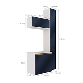Acabamento: Pintura Brilho / Pintura Fosco | Cor: Branco/Azul Profundo | Dobradiça: Com Amortecimento / Sem Amortecimento | Garantia: 3 meses para defeito de fabricação | Matéria-prima: MDF | Peso suportado por cada prateleira: 7 kg | Puxadores: Alumínio / Metálicos | Quantidade de portas: 1 / 2 | Quantidade de prateleiras: 1 | Sistema de montagem: Parafuso Philips | Tipo de porta: Bater | Requer montagem: Sim