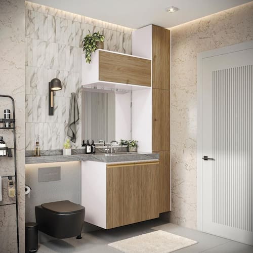 Modernidade e beleza sempre andam juntos, principalmente se aliados a qualidade do 100% MDF da Celeste da Kappesberg. Compacto e funcional, o combo CB1284 conta com cinco peças e amplo espaço para organizar toalhas, cestos e demais itens do seu dia a dia. Ideal para todos os espaços, ele é fácil de adaptar, e com até sete camadas de pintura, a caixaria é na cor branco brilho, enquanto as frentes são na cor nogueira, com acabamento touch. A combinação perfeita para todos os ambientes, garantindo elegância e aconchego, além de praticidade na limpeza, deixando seu banheiro completo. As portas contam com amortecimento, garantindo um fechamento suave, sem ruído e mais durabilidade, e para completar a beleza dos módulos, os puxadores, metálicos na cor dourada, contam com modelos diferentes no balcão e aéreos, transformando seu projeto com estilo. Aposte na Celeste e monte seu banheiro com toda a beleza e praticidade que a Kappesberg oferece.
