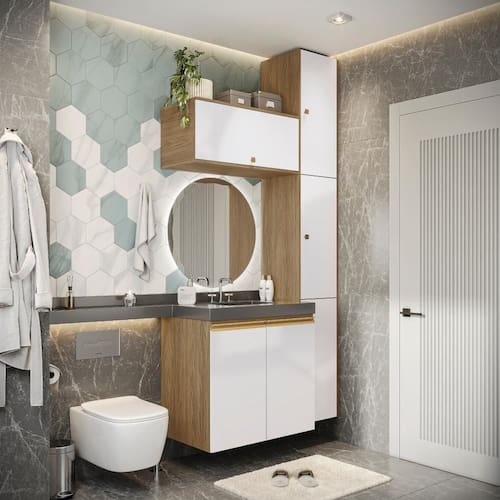 Modernidade e beleza sempre andam juntos, principalmente se aliados a qualidade do 100% MDF da Celeste da Kappesberg. Compacto e funcional, o combo CB1284 conta com cinco peças e amplo espaço para organizar toalhas, cestos e demais itens do seu dia a dia. Ideal para todos os espaços, ele é fácil de adaptar, e com até sete camadas de pintura, a caixaria é na cor nogueira, com acabamento touch, enquanto as frentes são em branco brilho. Uma combinação sofisticada e única, que trará conforto e elegância para todos os ambientes, deixando seu banheiro completo. As portas contam com amortecimento, garantindo um fechamento suave, sem ruído e mais durabilidade, e para completar a beleza dos módulos, os puxadores, metálicos na cor dourada, contam com modelos diferentes no balcão e aéreos, transformando seu projeto com estilo. Aposte na Celeste e monte seu banheiro com toda a beleza e praticidade que a Kappesberg oferece.