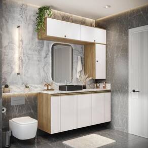 O máximo de beleza e espaço para seu banheiro aliado a qualidade do 100% MDF, só com a Celeste da Kappesberg. Ideal para quem procura por muito espaço, ele encaixa perfeitamente em ambientes maiores, garantindo organização e praticidade no seu dia a dia. E com até sete camadas de pintura, a caixaria é na cor nogueira com acabamento touch, enquanto as frentes são em branco brilho, a composição ideal para quem não abre mão de sofisticação, beleza e aconchego, deixando seu banheiro com um design único. Com sete módulos, o combo CB1281 conta com divisórias perfeitas para um banheiro sempre organizado e funcional. Os módulos de nicho possuem corrediças telescópicas, que facilitam o armazenamento de itens menores e acessórios, além de mais praticidade no manuseio. Enquanto as portas, com amortecimento, garantem um fechamento suave, sem ruídos e mais durabilidade, e com diversas prateleiras, será fácil organizar toalhas, cestos e demais itens na parte interna. A beleza dos módulos se completa com os puxadores, metálicos na cor dourada e com modelos diferentes nos balcões e aéreos, transformando seu projeto com estilo. Aposte na Celeste e monte seu banheiro com toda a beleza e praticidade que a Kappesberg oferece.