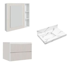 O Conjunto é composto por GABINETE + ESPELHEIRA + LAVATÓRIO. GABINETE fabricado em MDP BP (15mm), com ripas autênticas de HDF BP (06mm), na largura de 20mm. Puxadores de alumínio anodizado; caixaria estruturada com cantoneiras metálicas; gavetas com corrediças telescópicas proporcionando abertura total das mesmas; gaveta com divisores e higiênico organizador dental (removível e lavável); e gaveta interna com manta anti-derrapante, protegendo o fundo da mesma. ESPELHEIRA possuí espelho de 550 X 390 X 03 mm com acabamento lapidado, estruturado em porta com ripas autênticas de HDF BP (06mm). Possui prateleiras internas, porta com dobradiças slow, com sistema de amortecedor e nicho com prateleiras ao lado, para maior organização. LAVATÓRIO com cuba esculpida, fabricado em porcelanato, com baix Altura do Conjunto: 70 cm Ambiente: null Ambiente Principal: Banheiro Cor: Branco Informação Complementar: 1x Lavatório em Porcelanato 80cm Com Cuba Esculpida Lavatórios Calacata Largura: 80 Altura: 22.2 Peso: 17.935 Profundidade: 48.5 Necessita Montagem: Não