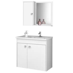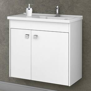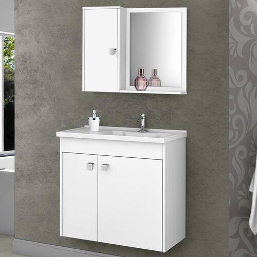 Conjunto para banheiro composto por lavatório em mármore sintético, armário superior, espelheira e gabinete, elaborado em MDF com espessura de 12 mm. Pintura da superfície em verniz poliéster brilhante, com secagem UV e impressão a laser. Acabamento nas bordas com fita de papel decorativo aplicado mecanicamente por sistema hot melting. Puxadores de plástico com acabamento cromado, dobradiças metálicas.