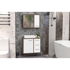 Composto por Espelheira com armário com porta, prateleira interna e espelho, e Gabinete com duas portas, três gavetas com corrediças telescópicas e cuba de apoio / sobrepor inclusa.