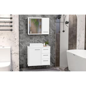 Os puxadores em ABS dão o toque final de sofisticação a esse lindo conjunto. Acabamento da Cuba: Acetinado Acabamento da Gaveta: Pintura UV Acabamento da Porta: Pintura UV Acompanha Cuba: Sim Acompanha Manual de Instalação: Sim Acompanha Parafusos Para Fixação Na Parede: Sim Ambiente Principal: Banheiro codigo_ean: 7909903618998 Cor: Branco Cor da Cuba: Branco Cor do Produto: Branco Cor Interna: Branco Escala de Brilho: Brilhante Escala de Brilho da Gaveta: Brilhante Escala de Brilho da Porta: Brilhante Furação para Cuba e Torneira: Sim Gaveta com Chave: Não Itens Inclusos: Gabinete, Cuba, Espelheira com Armário, Puxadores, Itens para fixação Linha ou Coleção: Conjunto Turin 60 Manual de Montagem e Instalação: https://product-hub-prd.madeiramadeira.com.br/899040/documents/10ee154e-1424-44bf-b232-0d88100f524754manualinstalacaocasanova.pdf Material da Cuba: Mármore Sintético Material da Gaveta: MDF Material da Porta: MDF Material do Puxador da Gaveta: ABS Material do Puxador da Porta: ABS Material do Tampo: MDF Material Principal: MDF Medida da Cuba (C x L x P): 38 x 30 x 11 cm Necessita Montagem: Não Origem do Produto: Nacional Peso: 26,5 kg Peso Máximo por Gaveta: 2 kg Possui Nichos: Não Possui Pés: Não Possui Portas: Sim Possui Prateleiras: Não Possui Recorte No Tampo Para Cuba: Não Possui Recorte No Tampo Para Misturador: Não Possui Sifão: Não Possui Tampo: Sim Produto Montado: Não Quantidade de Gavetas: 03 Recomendações de Uso, Manutenção e Limpeza: Limpeza com pano úmido Resistente à Chuva: Não Suporta Até (kg): 10 kg Tipo de Corrediça: Metálica Telescópica Tipo de Corrediça da Gaveta: Metálica Telescópica Tipo de Dobradiça/Corrediça da Porta: Metálica Tipo de Móvel para o Banheiro: Gabinete de Banheiro Tipo de Porta: Basculante Tipo de Puxador da Gaveta: Externo Tipo de Puxador da Porta: Externo Tipo do produto: Conjunto para Banheiro Válvula indicada: Válvula Padrão