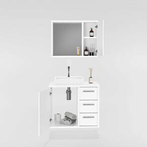 Composto por Espelheira com armário com porta, prateleira interna e espelho, e Gabinete com duas portas, três gavetas com corrediças telescópicas e cuba de apoio / sobrepor inclusa.
