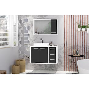 Os puxadores em ABS dão o toque final de sofisticação a esse lindo conjunto. Acabamento da Cuba: Polido Acabamento da Gaveta: Pintura UV Acabamento da Porta: Pintura UV Acompanha Cuba: Sim Acompanha Manual de Instalação: Sim Acompanha Parafusos Para Fixação Na Parede: Sim Ambiente Principal: Banheiro codigo_ean: 7909903619223 Cor: Branco/ Preto Cor da Cuba: Branco Cor do Produto: Branco/ Preto Cor Interna: BRANCO Escala de Brilho: Brilhante Escala de Brilho da Gaveta: Brilhante Escala de Brilho da Porta: Fosco Furação para Cuba e Torneira: Sim Gaveta com Chave: Não Itens Inclusos: Gabinete, Cuba, Espelheira com Armário, Puxadores, Itens para fixação Linha ou Coleção: CONJUNTO TURIN 80 Manual de Montagem e Instalação: https://product-hub-prd.madeiramadeira.com.br/899112/documents/ea5e1640-0b68-451a-8438-0bbedba774f097manualinstalacaocasanova.pdf Material da Cuba: Mármore Sintético Material da Gaveta: MDF Material da Porta: MDF Material do Puxador da Gaveta: ABS Material do Puxador da Porta: ABS Material Principal: MDF Medida da Cuba (C x L x P): 38 x 30 x 11 cm Necessita Montagem: Não Origem do Produto: Nacional Peso: 30,2 kg Peso Máximo por Gaveta: 2 kg Possui Nichos: Não Possui Pés: Não Possui Portas: Sim Possui Prateleiras: Não Possui Recorte No Tampo Para Cuba: Não Possui Recorte No Tampo Para Misturador: Não Possui Sifão: Não Possui Tampo: Não Produto Montado: Não Quantidade de Gavetas: 03 Recomendações de Uso, Manutenção e Limpeza: Limpeza com pano úmido Resistente à Chuva: Não Suporta Até (kg): 10 kg Tipo de Corrediça: Metálica Telescópica Tipo de Corrediça da Gaveta: Metálica Telescópica Tipo de Dobradiça/Corrediça da Porta: Metálica Tipo de Móvel para o Banheiro: Gabinete de Banheiro Tipo de Porta: Basculante Tipo de Puxador da Gaveta: Externo Tipo de Puxador da Porta: Externo Tipo do produto: CONJUNTO PARA BANHEIRO Válvula indicada: Válvula Padrão