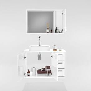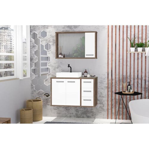 Composto por Espelheira com armário com porta, prateleira interna e espelho, e Gabinete com duas portas, três gavetas com corrediças telescópicas, tampo de vidro e cuba de apoio / sobrepor inclusa.