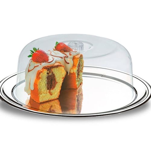 O conjunto para bolos da linha Petúnia é sofisticado, discreto e multifuncional. O produto é perfeito para servir bolos com elegância e também para evitar as visitas indesejadas de bichinhos e impedir o ressecamento das suas delícias em função do contato com o ambiente externo. Seu prato em aço inox é resistente e não possui porosidades, o que facilita a limpeza. Além disso, o material não altera o sabor e aroma dos alimentos. A cúpula em PS transparente deixa a beleza de seu bolo à mostra, mas o mantém protegido.