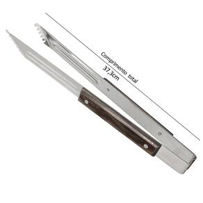 Faca, garfo trinchante e pegador para carne produzidos com lâminas de aço inox e cabos de madeira tratada com resistência à impactos e altas temperaturas.