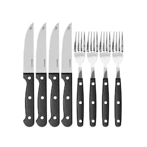 Material: Aço inoxidável e cabos em polipropileno. Cor: Cabo preto. Quantidade: 8 peças. Composição do Kit: 4 Garfos Jumbo – 20cm x 2,5cm x 1,8cm. 4 Facas Jumbo – 23,5cm x 2,5cm x 1,5cm. Rebites: Aço inoxidável. 100% Reciclável. Resistência: Alta durabilidade para uso frequente. Transforme Seu Churrasco em uma Experiência Completa! Com o Conjunto de Talheres Jumbo, cada corte será feito com precisão e elegância. Garanta o seu agora e leve mais sofisticação para seus momentos à mesa!