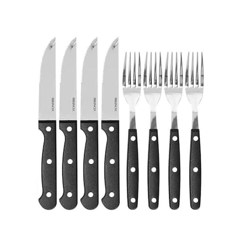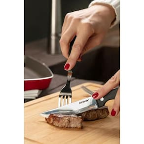 Corte Perfeito e Durabilidade Com lâminas em aço inoxidável, os talheres garantem cortes precisos, preservando a textura e suculência da carne. O material de alta qualidade proporciona resistência, durabilidade e um visual sofisticado para qualquer ocasião.