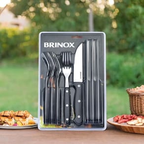 Conforto e Praticidade Os cabos ergonômicos de polipropileno garantem um manuseio firme e confortável, enquanto os rebites em aço inox aumentam a durabilidade do conjunto. Além disso, os talheres são 100% recicláveis e podem ser levados à lava-louças, facilitando a limpeza pós-churrasco.