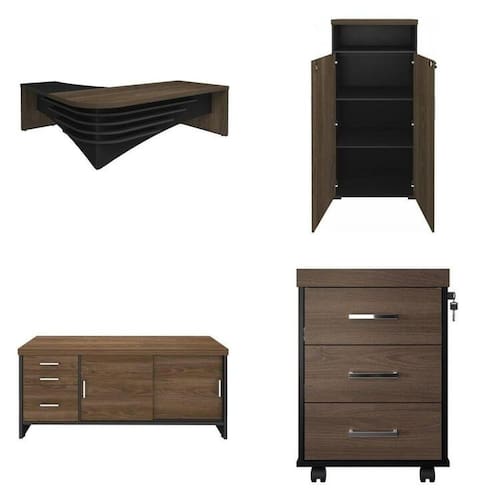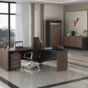 Conjunto completo para escritório, ideal para diretores e profissionais exigentes. Inclui Mesa robusta em tamburato, oferecendo durabilidade e estilo contemporâneo. O Gaveteiro proporciona organização eficiente, enquanto o armário com nicho adiciona espaço para arquivo e objetos pessoais. O Balcão integrado facilita reuniões e atendimento ao cliente, garantindo funcionalidade otimizada. Moderno módulo complementa o conjunto, proporcionando versatilidade e harmonia ao ambiente de trabalho. Altura do Conjunto: 173 cm Ambiente: null Ambiente Principal: Escritório Cor: Charuto/Preto Informação Complementar: 1x Mesa para Escritório Diretor em L em Tamburato Charuto/Preto Largura: 200 cm Altura: 75 cm Peso: 89 kg Profundidade: 180 cm Necessita Montagem: Sim