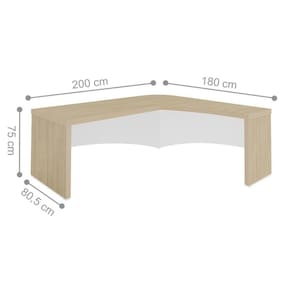 A mesa é feita em MDP, e contém o formato em L com seu design arredondado.
