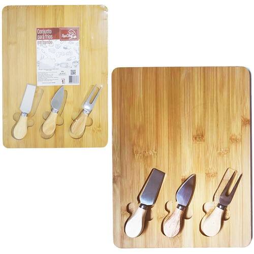 Conjunto para queijo e frios com 2 facas + garfo de inox e tabua retangular bambu 33x25cm