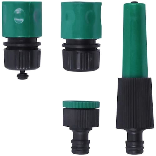 O kit é composto por 4 peças, sendo 1 esguicho ajustável e 3 adaptadores/acessórios para mangueira de 1/2, todos produzidos em plástico resistente com engate rápido, proporcionando durabilidade, resistência e fácil manuseio. O esguicho regulável permite controlar o fluxo de água, adaptando a intensidade do jato conforme a necessidade das plantas, enquanto os adaptadores facilitam a conexão de mangueiras e torneiras, tornando a irrigação mais prática e eficiente.