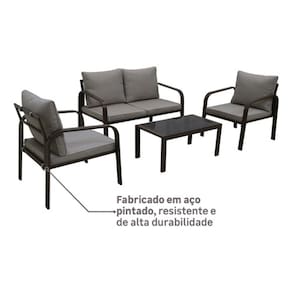 A mesa de centro, com tampo de vidro e formato retangular, e ideal para apoiar bebidas, livros ou decoracoes. A estrutura em metal, tambem em aco pintado marrom, complementa o design dos demais moveis do conjunto. Vale ressaltar que a mesa nao e dobravel, garantindo assim maior estabilidade. A poltrona e o sofa, por sua vez, possuem assentos e encostos em fibra sintetica e poliester, materiais conhecidos por sua resistencia e facilidade de limpeza.