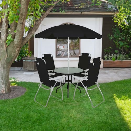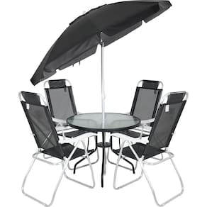Conjunto para Jardim Mesa com Tampo de Vidro e 4 Cadeiras e Ombrellone Noronha Bel Desfrute do melhor em lazer com o Conjunto Noronha de 6 pecas! Inclui uma mesa redonda de centro com tampo de vidro temperado de 5mm e estrutura resistente de aluminio. Voce tambem tera um ombrellone articulado em bagum reforcado, equipado com varetas em fibra de vidro para maior durabilidade. Alem disso, o conjunto conta com 4 cadeiras individuais reclinaveis em 4 posicoes, oferecendo conforto personalizado. Seus encostos e assentos sao feitos de poliester de alta qualidade, revestidos com PVC para facil limpeza, enquanto a estrutura de aluminio garante leveza e resistencia. Com o Conjunto Noronha, seu espaco de lazer sera transformado em um ambiente de relaxamento e estilo incomparaveis!