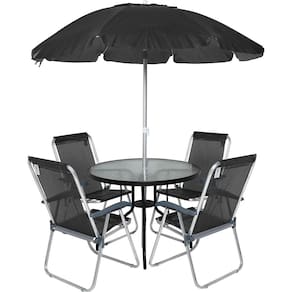 Conjunto para Jardim Mesa com Tampo de Vidro e 4 Cadeiras e Ombrellone Trancoso Bel seu espaco de lazer sera transformado em um ambiente de relaxamento e estilo incomparaveis! Com o conjunto de mesa e cadeira Trancoso fabricado em aluminio oferecendo conforto personalizado.