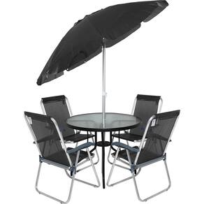 Caracterisitcas: Ombrellone com 200cm articulado 4 Cadeiras Mesa redonda com espaco para colcoar o Ombrellone Tampo de vidro 5mm Estrutura em Aluminio Peso Suportado da Cadeira 120 Kg