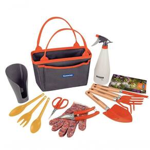 Modo de uso: Utilizado na agricultura, horticultura, fruticultura e jardinagem para serviços gerais. A pazinha larga é utilizada para cavar, remover e transportar a terra. ;A pazinha estreita é utilizada para cavar o solo e transplantar mudas. ;O arrancador de inço é utilizado para remover ervas daninhas (inços), a partir da raiz, em hortas, jardins, calçadas e locais de difícil acesso. O garfo é utilizado para afofar a terra e o solo. O ancinho é utilizado para afofar a terra e remover detritos. ;O contenedor serve para guardar ferramentas e transportar terra. ;A tesoura de poda é própria para poda de frutíferas, flores e plantas ornamentais. ;A tesoura para frutas é própria para colheita, desbaste ou raleio de frutas e poda de bonsai. O ;pulverizador é ideal para aplicação de , herbicidas, fungicidas, soluções naturais, adubo foliar e também para a umidificação de plantas. As luvas são utilizadas para conforto e proteção das mãos nas mais diversas atividades. ;A bolsa serve para carregar as ferramentas, oferecendo mais facilidade no cuidado das plantinhas. ;Para descarte dos produtos e embalagens siga as orientações de reciclagem vigentes.