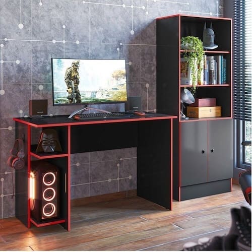 Com estilo moderno, o conjunto Gamer Qmovi, composto por Mesa e Armário Gamer, é perfeito para quem passa horas do dia jogando e/ou trabalhando. Seu design compacto é perfeito para ambientes menores que precisam de otimização do espaço. A mesa promove o conforto necessário para acompanhar os momentos de diversão e trabalho. Possui uma prateleira elevada para o CPU e suporte para fone de ouvido, pensados para a praticidade do dia. Já o armário, organiza seus objetos de maneira divertida e compõe o estilo Gamer do conjunto. Altura do Conjunto: 158.5 cm Ambiente: null Ambiente Principal: Escritório codigo_ean: 7909903555149 Cor: Preto / Vermelho Cor do Produto: Preto / Vermelho Informação Complementar: 1x Mesa para Escritório e Gamer com Suporte para CPU Preto Fosco/Vermelho Largura: 114 cm Altura: 75 cm Peso: 20,3 kg Profundidade: 54 cm Necessita Montagem: Sim