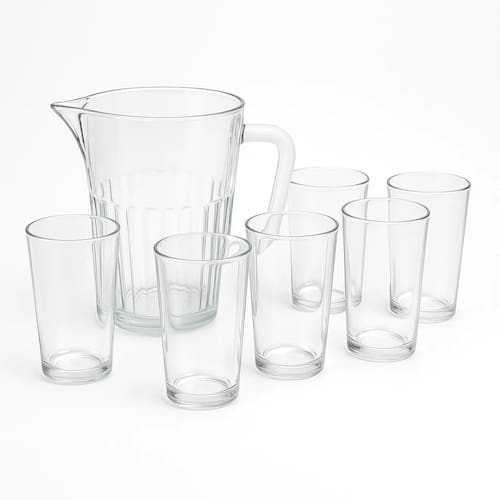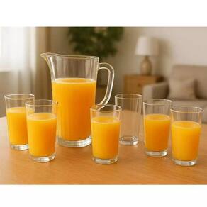 O kit é composto por 1 jarra e 6 copos, com material de qualidade em vidro liso e transparente não absorve odores nem sabores, e sua transparência realça a cor da bebida, tornando a apresentação mais apetitosa. Além disso, a praticidade e limpeza são garantidas, pois o material liso facilita a lavagem e é seguro para lava-louças.