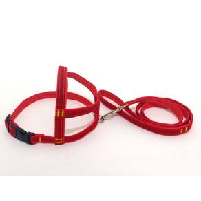 Peitoral confeccionado em tecido de veludo liso e nylon; Presilha com regulagens de tamanho em plastico resistente; Guia em tecido de veludo liso e nylon; Mosquetão médio com trava de segurança; Indicado para cachorros de pequeno e médio porte. Cor: vermelho.