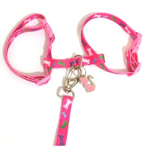 Acompanha guia de 90 cm em tecido de seda estampada com mosquetão pequeno;