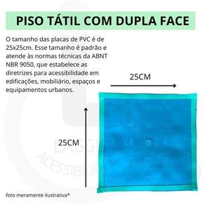 As placas de piso táteis são fabricadas em PVC, um material plástico durável e resistente ao desgaste. O PVC é leve e fácil de manipular, tornando a instalação mais conveniente. Com dimensões de 250x250x5mm, cada placa proporciona uma solução robusta para suas necessidades de acessibilidade.