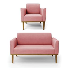 Conjunto Poltrona E Namoradeira Decorativa Pés Fixo Em Madeira Castanho Suede Rose - Blush