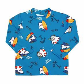 Deixe seu bebê protegido e estiloso com este conjunto de praia encantador! Composto por blusa de manga longa estampada de tubarões curtindo as férias, sunga tapa fralda e chapéu combinando, esse kit é perfeito para dias de sol. Possui proteção UV 50+ para máxima segurança contra os raios solares. O chapéu possui aba interna lisa, na mesma cor da sunga, garantindo um visual harmonioso. Confortável, prático e essencial para a diversão à beira-mar!