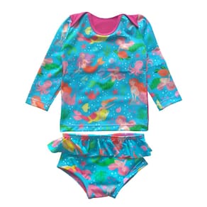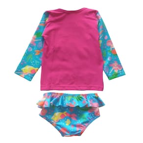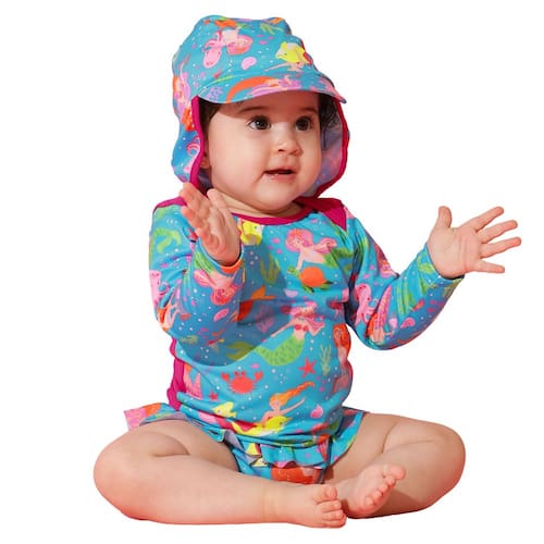 Leve diversão e segurança para os dias ensolarados com este encantador conjunto de praia bebê sereias divertidas. Com uma alegre estampa de sereias e elementos de fundo do mar, a blusa possui costas pink. A calcinha azul com babadinhos completa o visual, adicionando um toque adorável e delicado. Possui proteção UV 50+, que proporcionam leveza, flexibilidade, conforto, resistência a produtos químicos e conservação da temperatura corporal. Esse conjunto garante que sua bebê estará protegida dos raios solares enquanto aproveita o verão com estilo.
