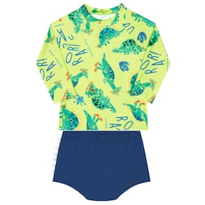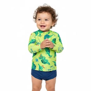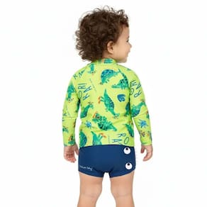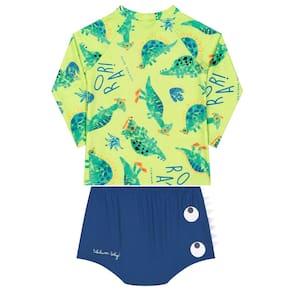 O Conjunto de praia Dinossauros Verde Limão com proteção UV 50+ é perfeito para bebês. Em um tom neon com sunga tapa fralda Azul Royal com detalhes nas laterais e olhinhos de dinossauro na parte traseira, este conjunto de manga longa conta com estampa de simpáticos dinossauros mergulhadores! Confortável, prático e seguro, ele é ideal para dias ensolarados na praia ou piscina, garantindo estilo e proteção para os pequenos.