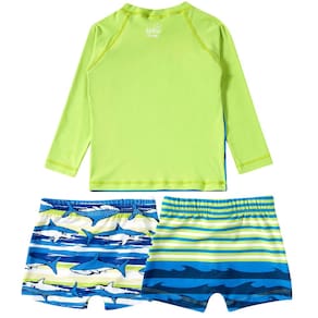 O Trio Camiseta e 2 Shorts Praia Infantil Tubarão Verde Neon da Tip Top é perfeito para os pimpolhos aproveitarem a praia ou piscina com todo conforto e proteção, e ainda com a opção de variar o look. Uma sunga boxer é estampada com tubarões e a outra é listrada. Possui proteção solar UV 50+ permanente.