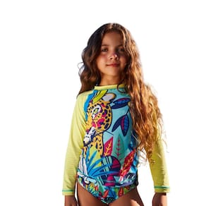 A modelagem do conjunto de praia para menina Onça Tropical Verde Flúor Tip Top é normal. Verifique a tabela de tamanhos e em caso de dúvidas, sempre opte por um número maior do que a criança usa.