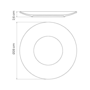 - Prato raso: 2,6 cm de altura x 28 cm de largura x 28 cm de profundidade