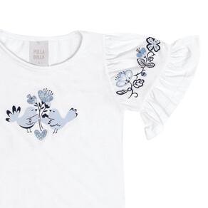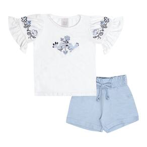 Conjunto composto pela blusa meia malha na cor branca com estampa floral junto com strass e pássaros na frontal da peça e nas mangas. O short em moletinho na cor hortênsia possuí elástico na cintura para maior conforto e movimentação segura e o laço para amarrar possuí miçangas nas pontas. Um verdadeiro charme!