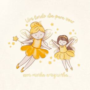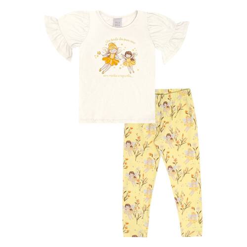 O dia na casa da madrinha pede por um look confortável e estiloso. Conjunto composto por uma blusa meia malha na cor off white com estampa de fadinhas em foil e a legging em cotton leve com elástico no cós para melhor movimentação e conforto com estampa digital de fadinhas na cor amarelo.