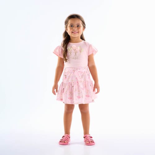 Delicado e especial! O conjunto composto por uma blusa meia malha na cor rosê possuí estampa com aplique de flores em foil e a saia em tricoline deixando o look mais leve na cor rosê com estampa sublimada rosê de fadinhas e elástico no cós deixando mais confortável e seguro.