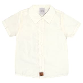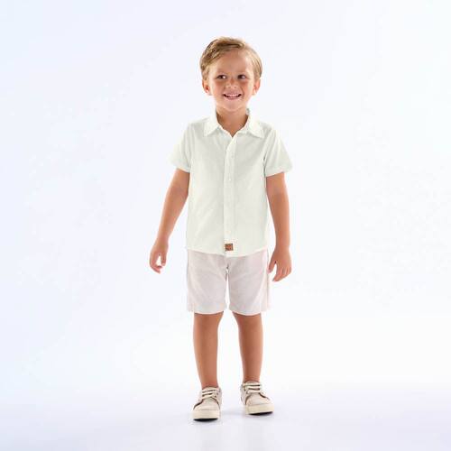 Conjunto Primeiros Passos ideal para usar em ocasiões especiais. Composto por uma camisa tricoline fresquinha na cor off white com abertura frontal de botões e aplique termocolante e a bermuda em tecido eco cáqui confortável com bolsos funcionais e cinto acompanhando o look.