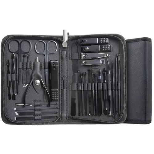 Material: Aço inoxidável Tamanho estojo : 17x11x2,5cm Cor: Preto Aplicação: Cuidados faciais, mãos e pés