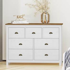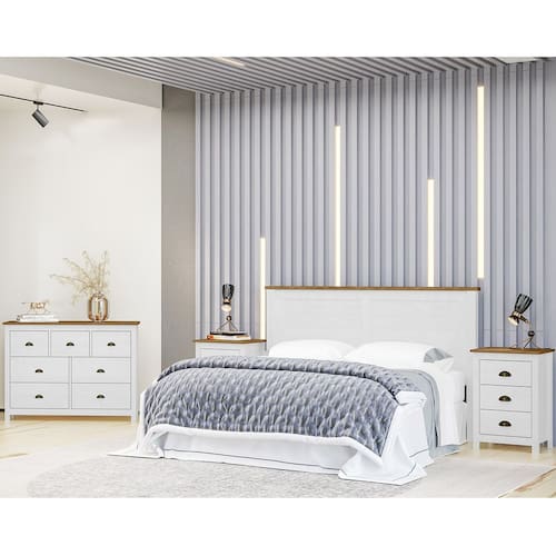 Conjunto Quarto: 1 Cabeceira, Cômoda 7 Gavetas e 2 Mesas de Cabeceiras Topázio Branco/Freijó Madeira Pinus - Finestra