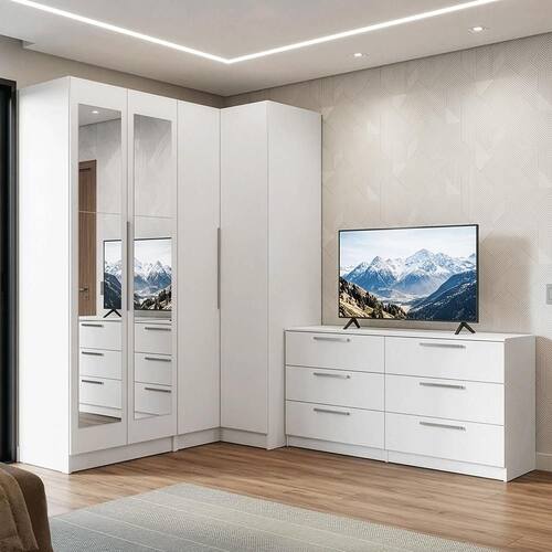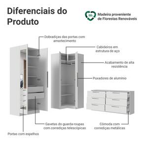 A composição une a versatilidade da linha Neo com a praticidade de uma cômoda, que também pode ser utilizada como apoio para televisão, deixando o ambiente ainda mais completo para a rotina. Além disso, as portas dos guarda-roupas possuem espelhos, um diferencial que valoriza o visual do ambiente.