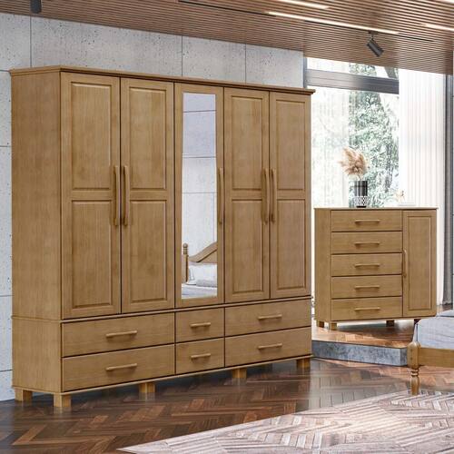 Conjunto Quarto: Guarda-Roupa 5 Portas, Cômoda Sapateira 5 Gavetas Ouro Freijó Madeira Pinus - Finestra