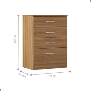 Compacta, ela conta com 4 gavetas, todas com corrediças metálicas telescópicas, sendo que a última é de maior profundidade e pode ser usada para guardar roupa de cama, toalhas ou casacos dobrados